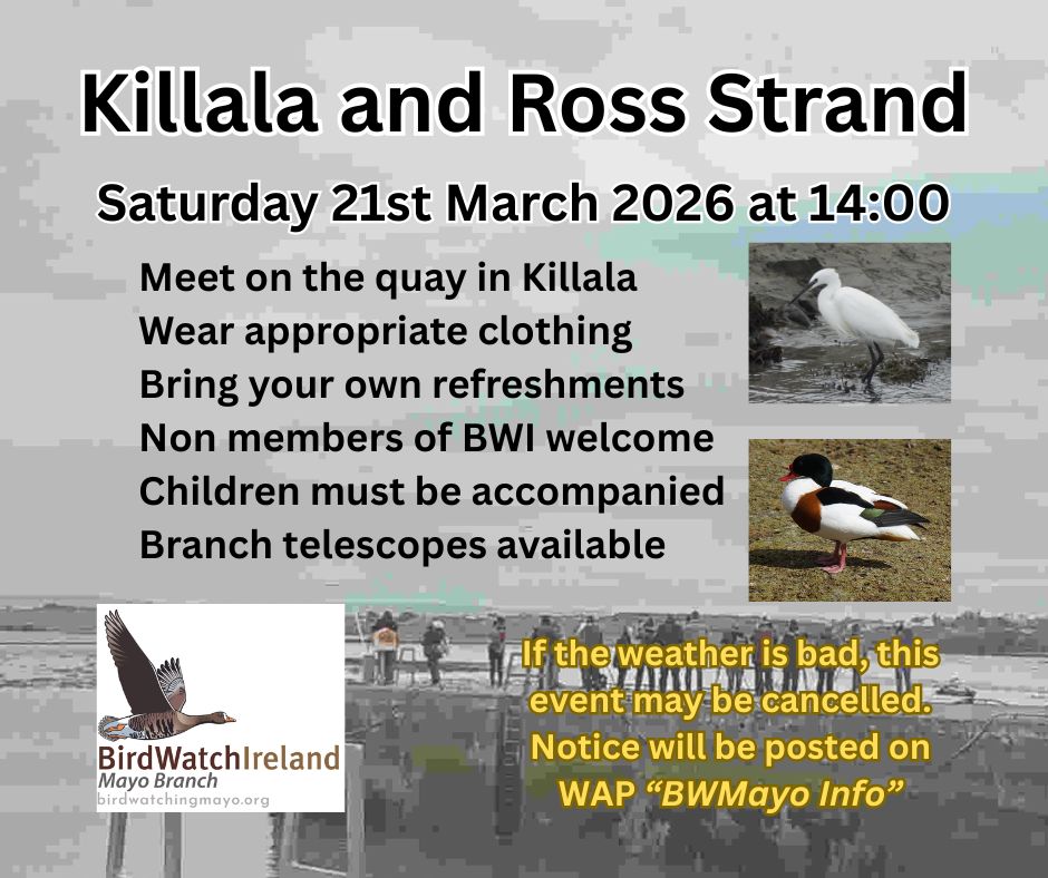We will meet at 14:00 hours on the quay in Killala opposite Homeland – F26 X363. Non-members of BirdWatch Ireland are welcome as are children who must be accompanied. Wear appropriate clothing and footwear for the conditions. Bring your own refreshments. At Ross Strand there will be the option to walk along the beach or view the bay from the raised car park area.